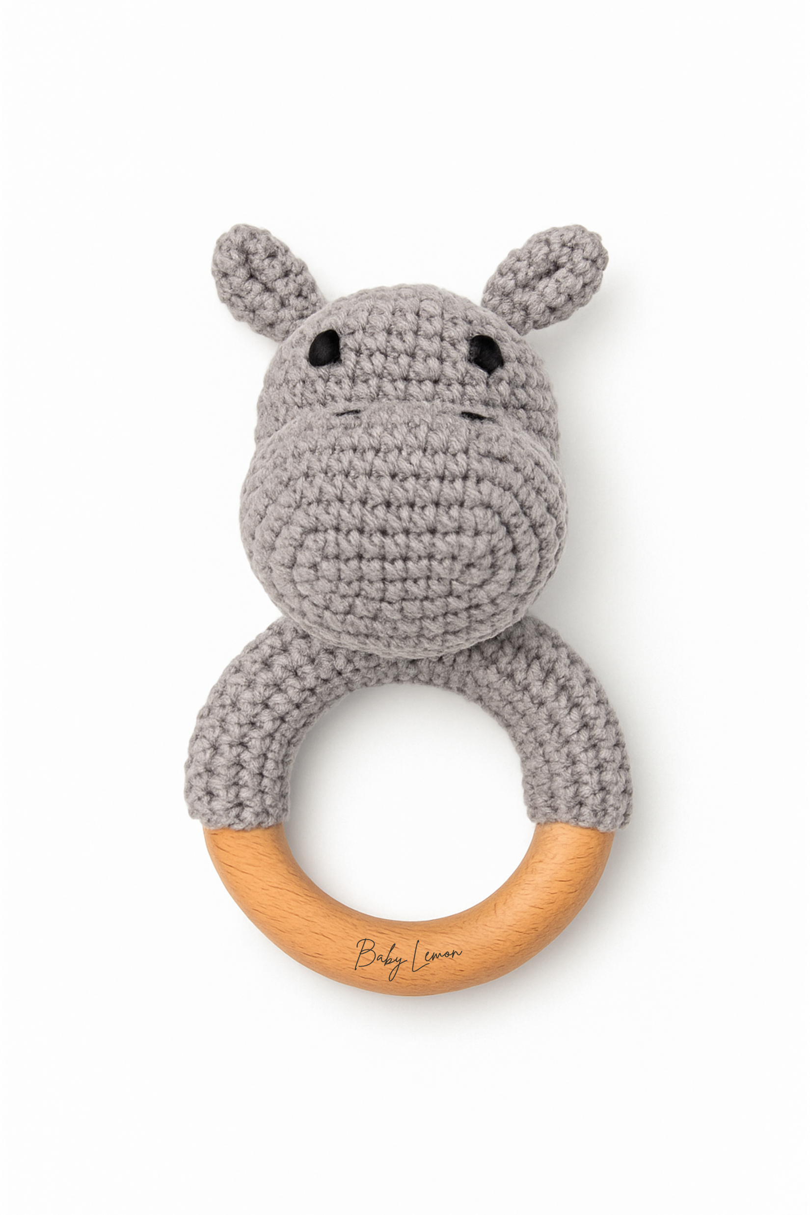 Den här handvirkade skallran i form av en flodhäst är tillverkad av mjukt bomullsgarn, vilket gör den skonsam mot små händer och perfekt för att väcka bebisens nyfikenhet och sinnen. Skallran ger ett mjukt och behagligt ljud när den skakas, vilket gör den både stimulerande och lugnande för bebisen.