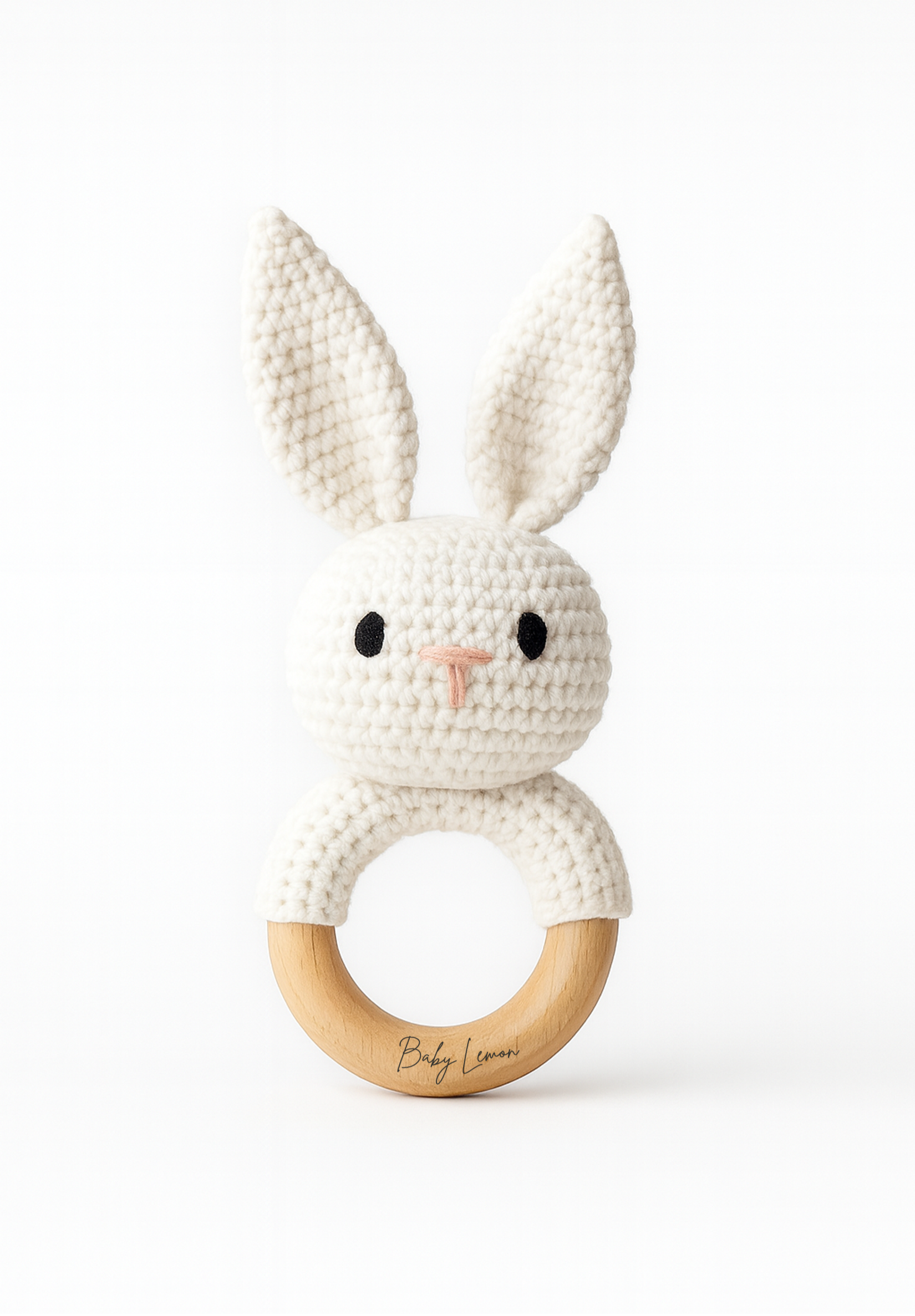 Denna handvirkade skallra i form av en söt kanin är en fin leksak som snabbt blir en favorit hos både bebis och föräldrar. Tillverkad av mjukt bomullsgarn är den både säker och skonsam för små händer att hålla och utforska.