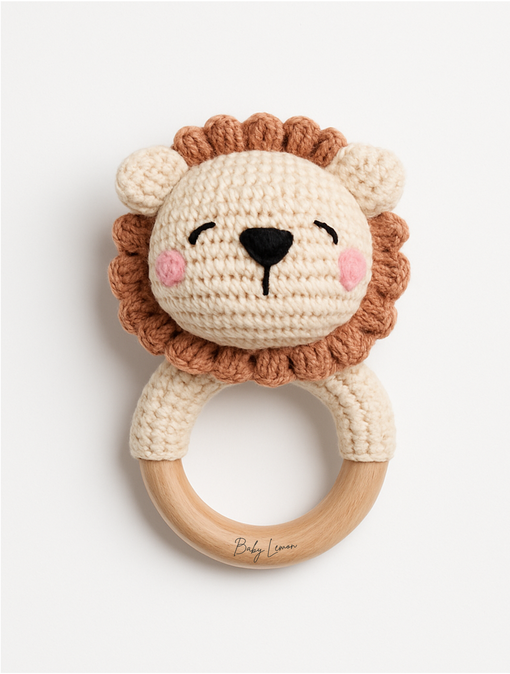 Den här handvirkade skallran i form av ett lejon är tillverkad av mjukt bomullsgarn, vilket gör den skonsam mot små händer och perfekt för att väcka bebisens nyfikenhet och sinnen. Skallran ger ett mjukt och behagligt ljud när den skakas, vilket gör den både stimulerande och lugnande för bebisen.