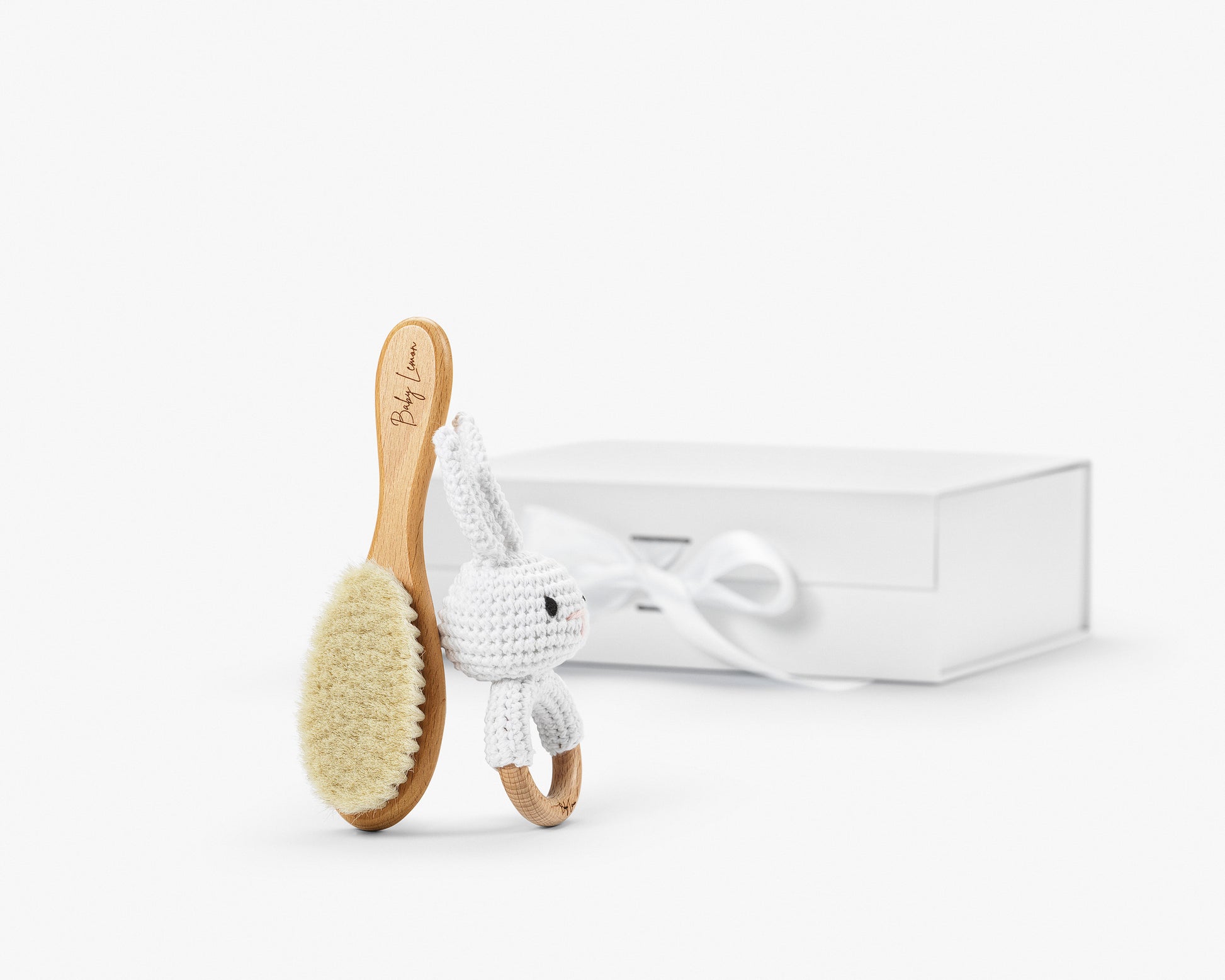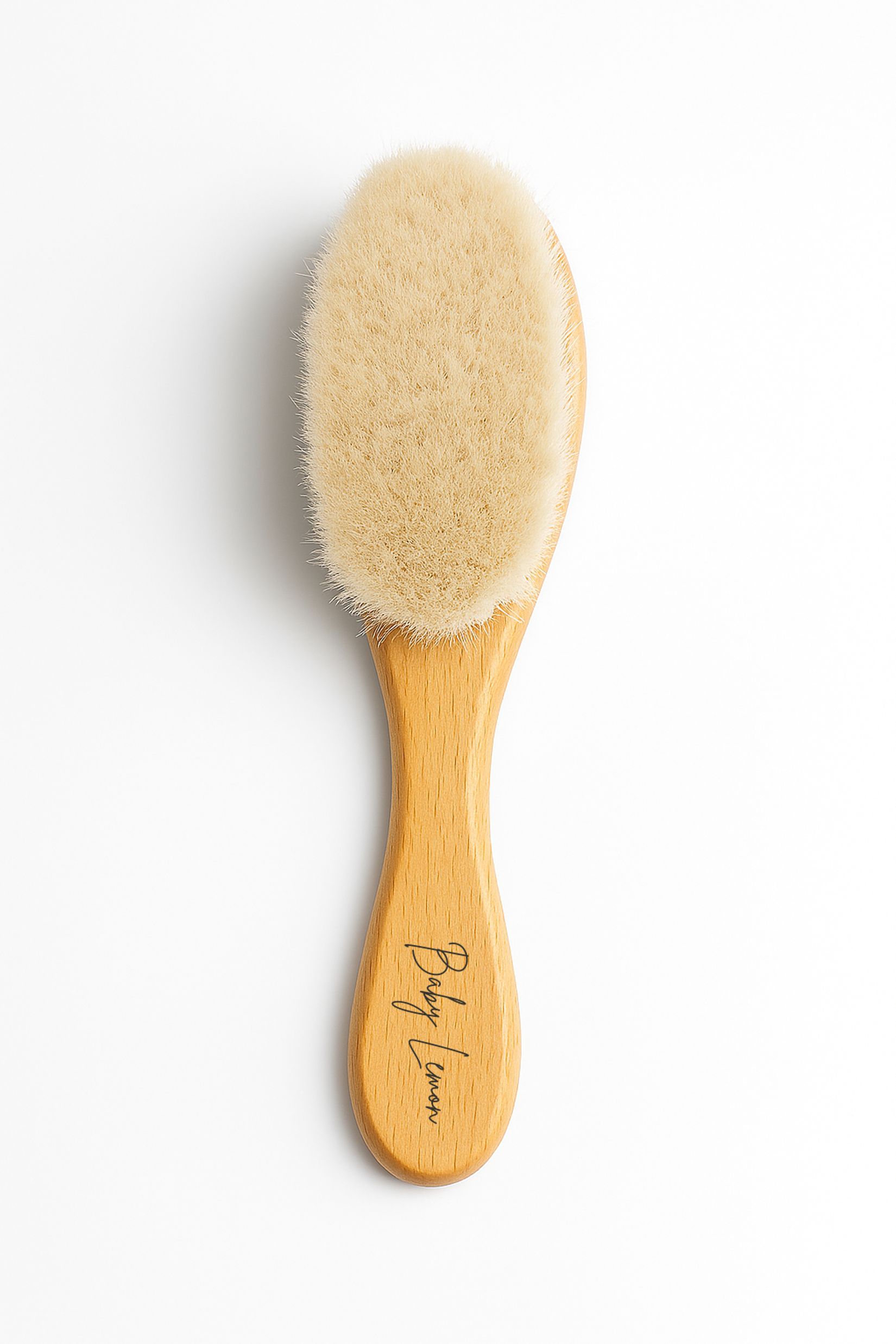 - En babyborste i bokträ: Med naturligt trä och mjuka borst är denna borste skonsam mot bebisens känsliga hårbotten. En praktisk och vacker detalj som passar perfekt i varje förälders babykit.
