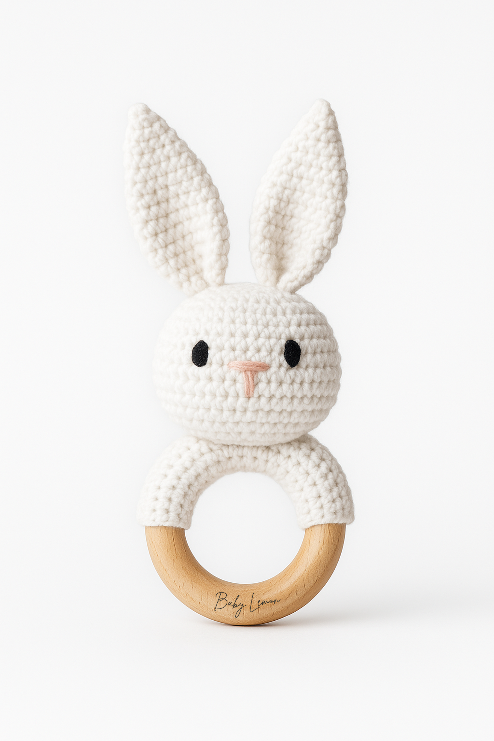 - En handvirkad skallra i form av en kanin: Skallran, tillverkad av mjukt och hållbart bomullsgarn, är designad för små händer och ger både lekfullhet och trygghet till bebisens första månader (CE-märkt).